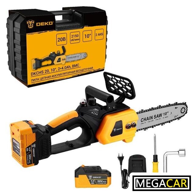| Комплект поставки | - Пила (основной корпус) - 1 шт.- Аккумулятор 4,0 Ач - 2 шт.- Зарядное устройство - 1 шт.- Шина - 1 шт.- Цепь - 1 шт.- Дополнительная рукоятка - 1 шт.- Защитный щиток - 1 шт.- Отвертка - 1 шт.- Торцевой ключ - 1 шт.- Руководство по эксплуатации- Кейс |