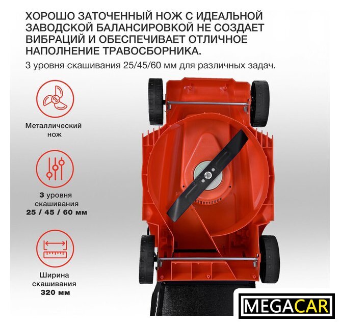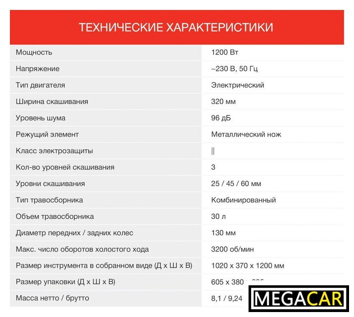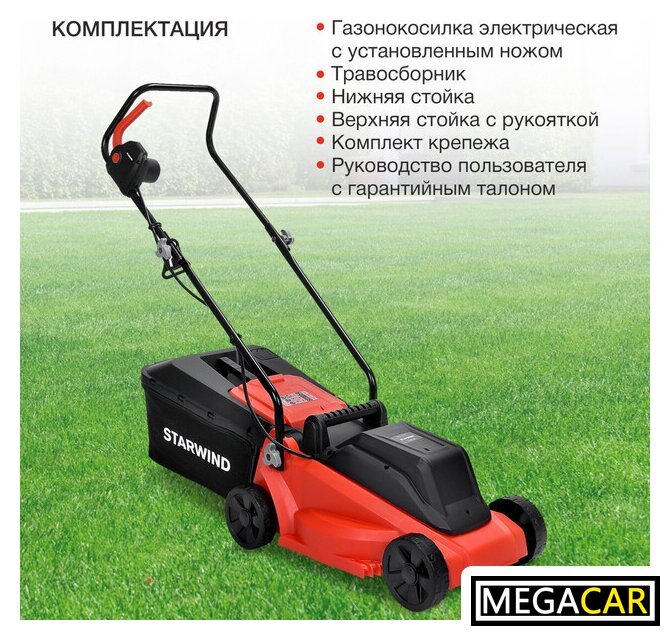 Комплектация | - газонокосилка, - травосборник,- рукоятка, комплект крепежа |