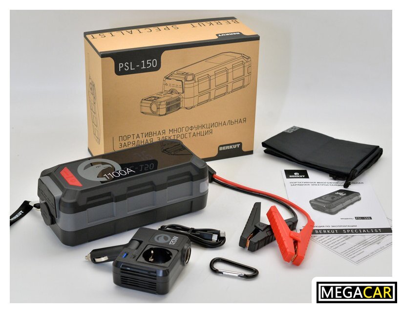 | Комплект поставки | 1. BERKUT PSL-150 - портативная электростанция2. INV-120 - Автомобильный инвертор AC220V/120W - 1 шт.3. Cиловые провода для запуска двигателя - 1шт.4. Кабель USB-C 100W для зарядки - 1шт.5. Руководство по эксплуатации6. Гарантийный талон7. Упаковочная коробка |