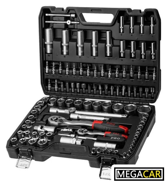 Комплектация | Головка торцевая 1/4": 4, 4.5, 5, 5.5, 6, 7, 8, 9, 10, 11, 12, 13, 14 мм;Головка торцевая длинная 1/4": 6, 7, 8, 9, 10, 11, 12, 13 мм;Головка торцевая 1/4": E4, E5, E6, E7, E8;Головка с насадкой HEX 1/4": H3, H4, H5, H6;Головка с насадкой TORX 1/4": T8, T10, T15, T20, T25, T30;Головка с насадкой SL 1/4": SL4, SL5.5, SL6.5;Головка с насадкой PH 1/4": PH1, PH2;Головка с насадкой PZ 1/4": PZ1, PZ2;Головка торцевая 1/2": 10, 11, 12, 13, 14, 15, 16, 17, 18, 19, 20, 21, 22, 23, 24, 27, 30, 32 мм;Головка торцевая длинная 1/2": 14, 15, 17, 19, 22 мм;Головка торцевая 1/2":E10, E11, E12, E14, E16, E18, E20, E24;Свечная головка 1/2": 16, 21 мм;Насадка 5/16" HEX: H7, H8, H10, H12, H14;Насадка 5/16" TORX: T40, T45, T50, T55, T60;Насадка 5/16" SL: SL8, SL10, SL12;Насадка 5/16" PH: PH3, PH4;Насадка 5/16" PZ: PZ3, PZ4;Трещотка 1/4";Удлинитель 1/4" 50 мм;Удлинитель 1/4" 100 мм;Кардан 1/4";Вороток-отвертка 1/4" 150 мм;Вороток 1/4" с плавающей головкой 115 мм;Трещотка 1/2";Переходник (держатель для бит) 1/2"х5/16"(HEX);Переходник 3/8"(F)х1/2"(М) с отверстием;Удлинитель 1/2" 125 мм;Удлинитель 1/2" 250 мм;Кардан 1/2";Ключ шестигранный Г-обр.: 1.5, 2, 2.5 мм;Кейс |